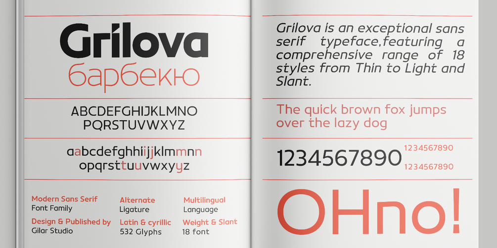 Grilova is an exceptional sans serif typeface, featuring a comprehensive range of 18 styles from Thin to Light and Slant. This typeface is designed with a variety of advanced typographic features, including alternates, ligatures, numerators, and denominators. With support for over 96 languages, Grilova ensures broad compatibility and usability.
